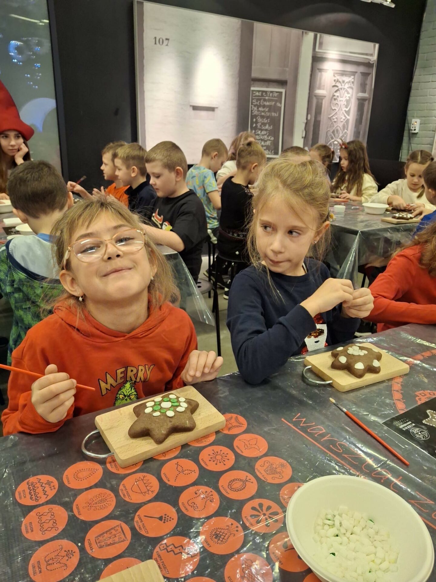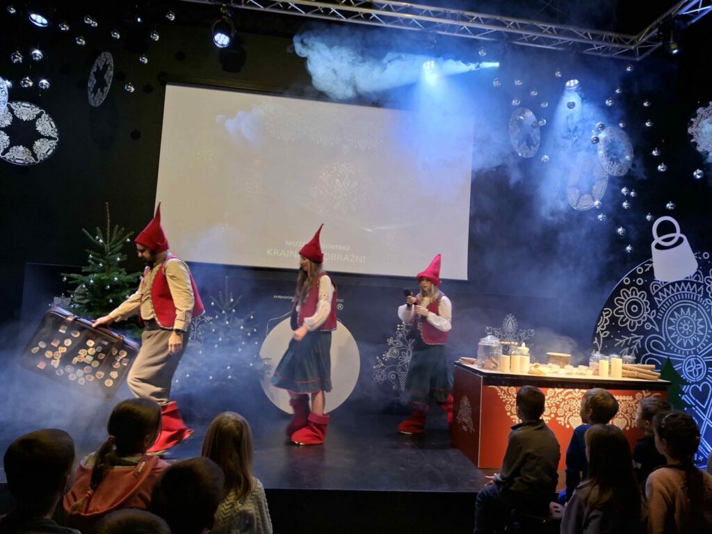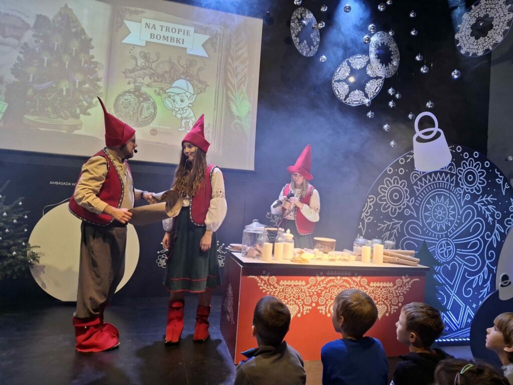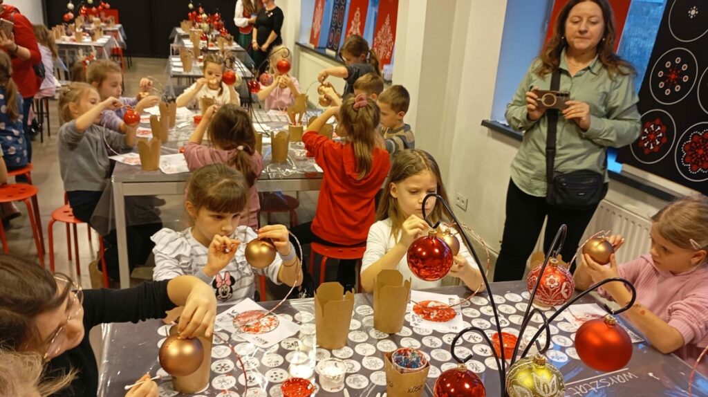Najpierw spotkaliśmy się z Elfami, od których dowiedzieliśmy się, że tradycja ozdabiania choinki narodziła się w Niemczech. Podczas warsztatów rozwijaliśmy naszą kreatywność ozdabiając własne bombki i pierniczki dolnośląskim wzornikiem, czyli nakładaliśmy kropkowane wzorki. Niektórzy odkryli w sobie talent artystyczny – Picasso byłby dumny!