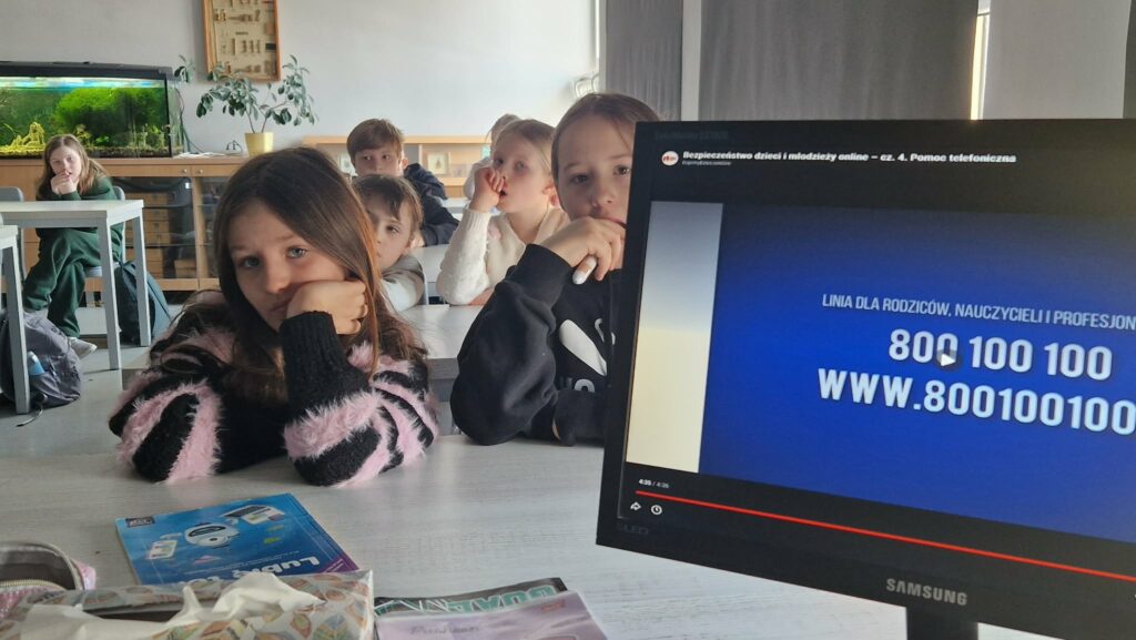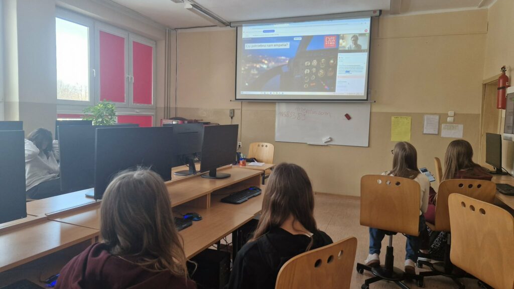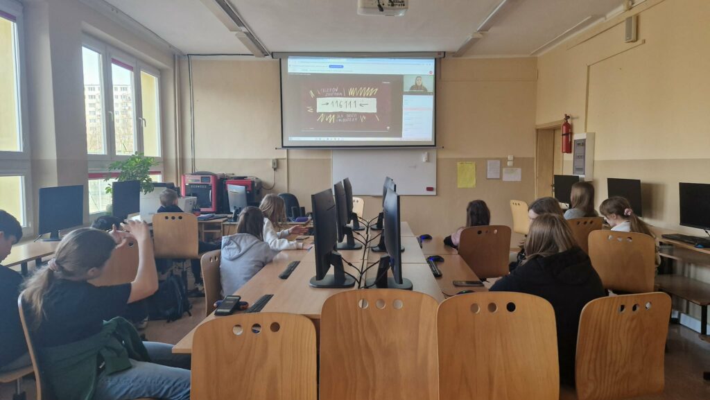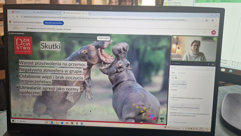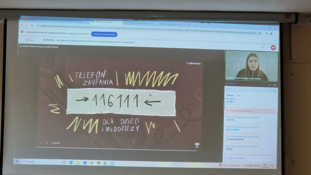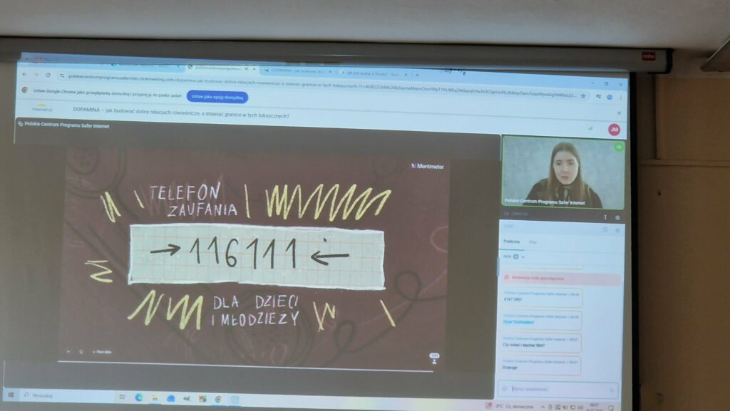 Uczestniczyliśmy również w trzech lekcjach online organizowanych przez Polskie Centrum Programu Safer Internet: „Ciało nie określa”, „DOPAMINA – jak budować dobre relacjach rówieśnicze, a stawiać granice w tych toksycznych?”, „Jak reagować na przemoc? Rozpoznaj, zareaguj, zatrzymaj․”