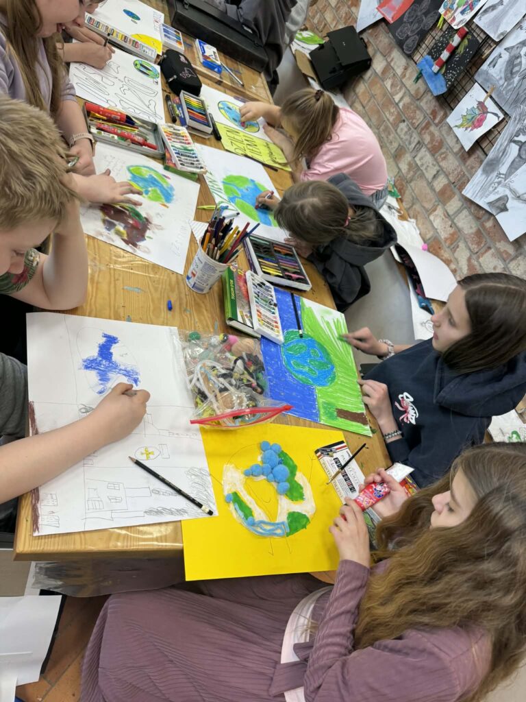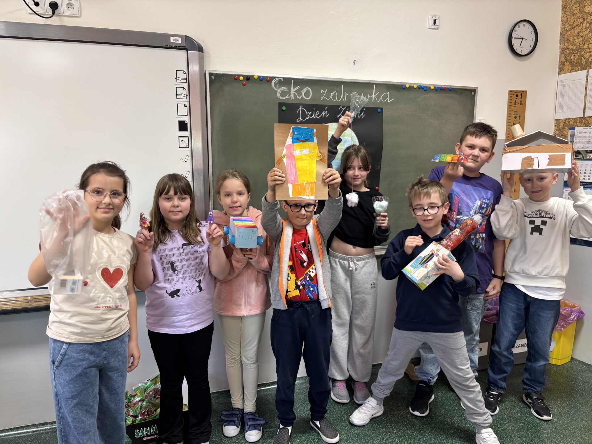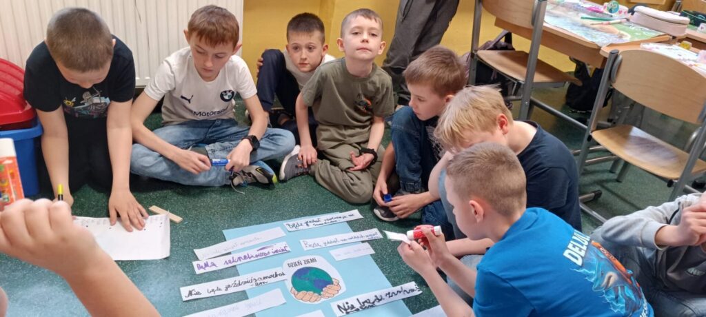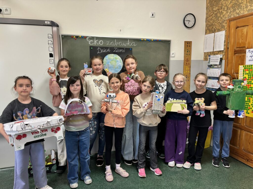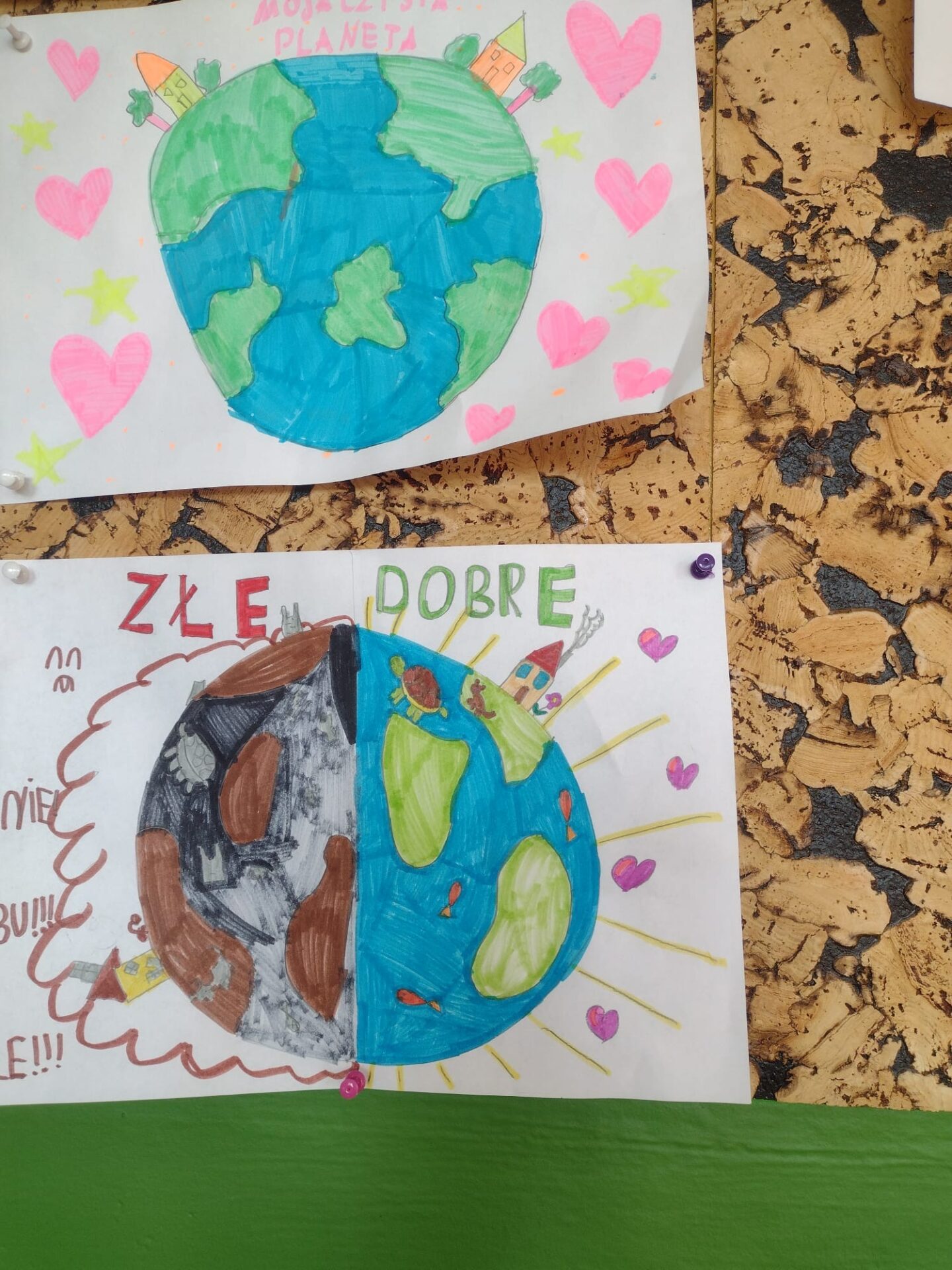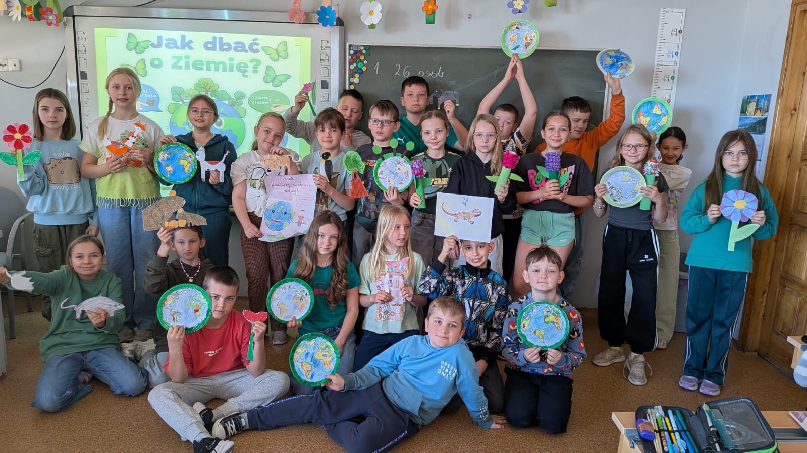 Z okazji Dnia Ziemi w budynku A odbyły się różnorodne działania o charakterze edukacyjnym i artystycznym. Uczniowie klas młodszych uczestniczyli w lekcjach poświęconych ochronie środowiska, przygotowywali gazetki tematyczne oraz śpiewali piosenki związane z przyrodą. Klasy czwarte wykonały plakaty promujące postawy ekologiczne. Prace te zostały wyeksponowane w holu szkoły, stanowiąc piękne podsumowanie obchodów tego ważnego dnia.