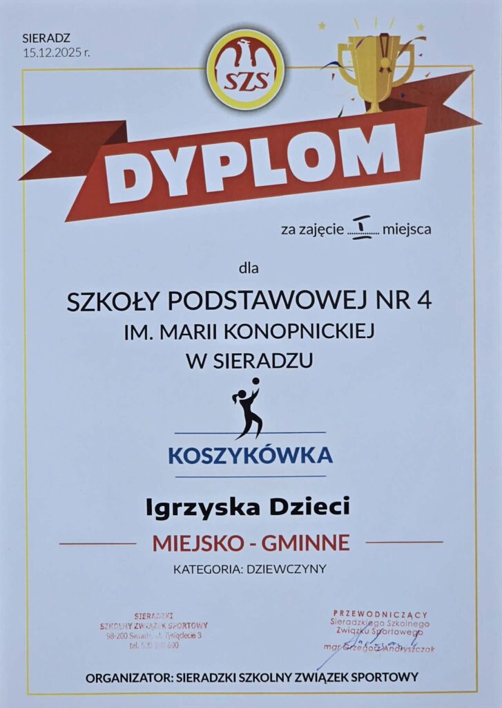 W dniu 15 grudnia 2025r. w sali gimnastycznej budynku „B” naszej szkoły rozegrane zostały Igrzyska Dzieci w mini piłce koszykowej dziewcząt. Zawodniczki, po świetnym występie, zajęły I miejsce i wywalczyły awans do kolejnego etapu rozgrywek, który rozegrany zostanie już w nowym, 2026r. Trzymamy kciuki za kolejne wygrane i dalsze awanse.