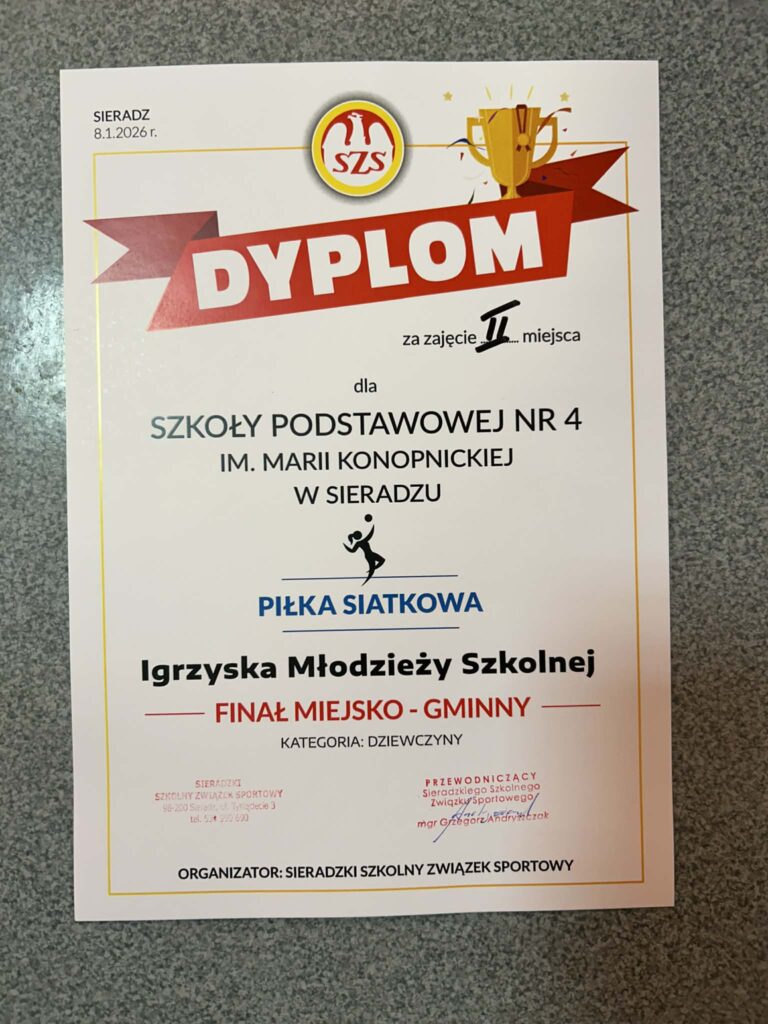 W dniu 8.01.2026r. nasza szkoła brała udział w zawodach piłki siatkowej w kategorii klasy 7-8. Nasza drużyna zaprezentowała się znakomicie, zdobywając drugie miejsce na podium. Mimo zaciętej rywalizacji, zespół pokazał wielką determinację i wolę walki w każdym meczu.