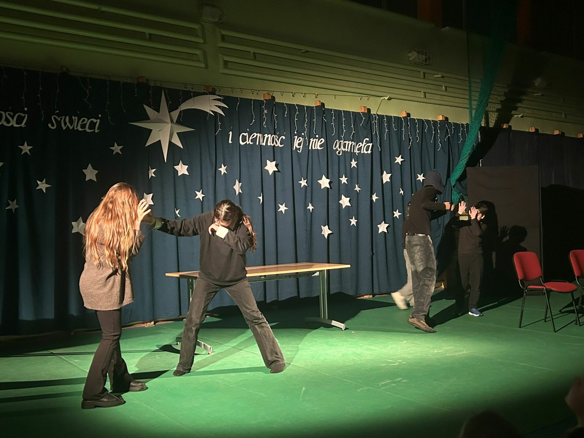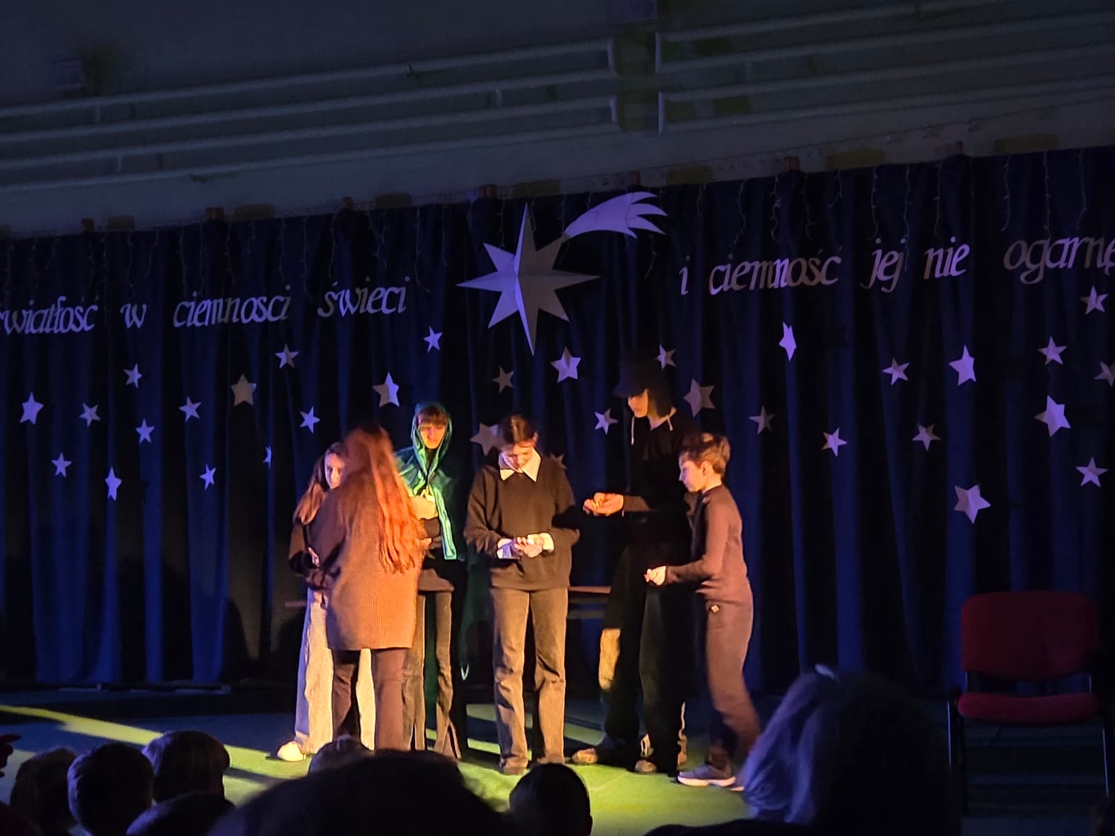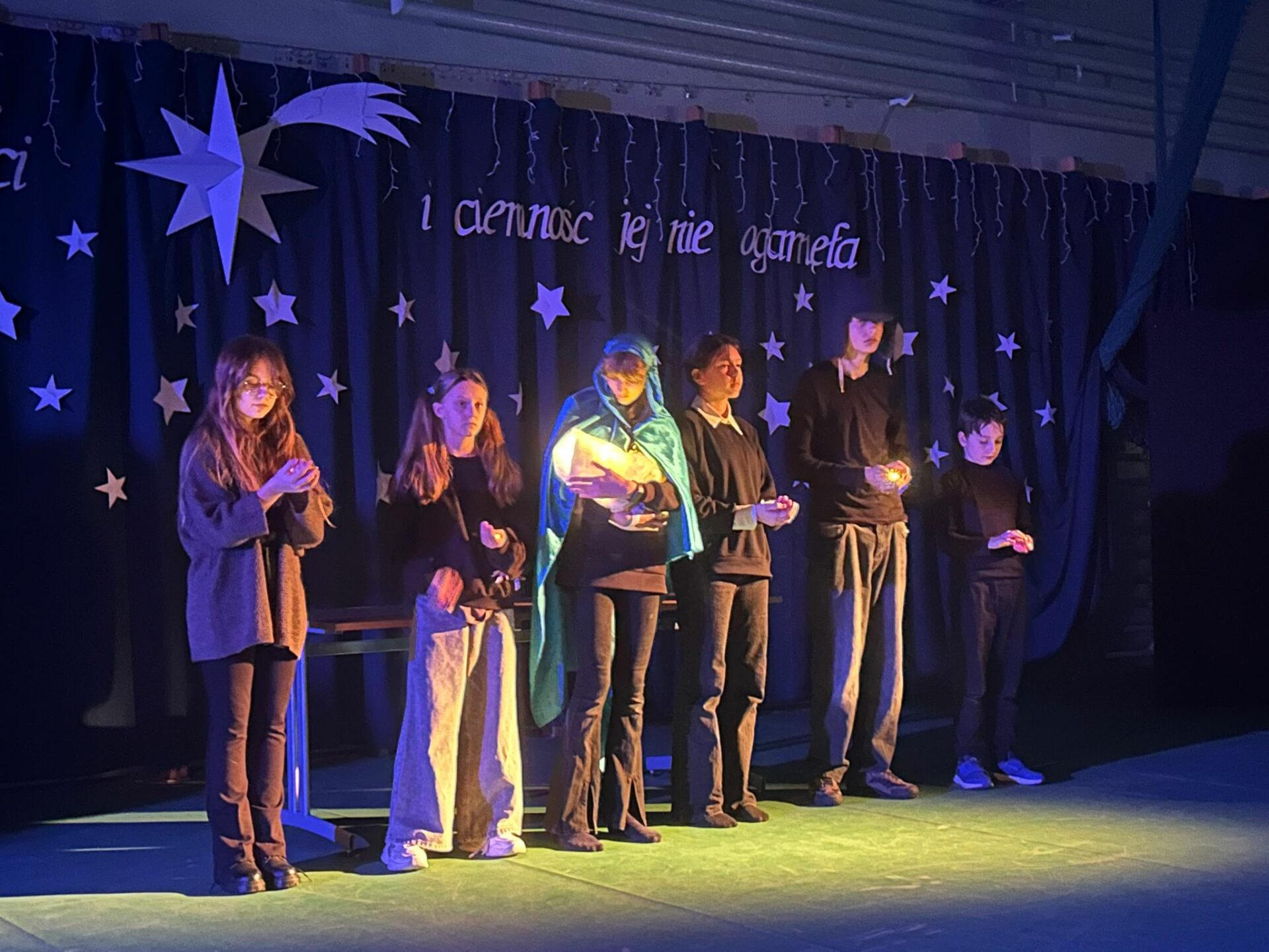 11 grudnia o godzinie 17.00 szkolne koło teatralne oraz chór zaprezentowały przedstawienie wigilijne. Jego motywem przewodnim było światło, które „świeci w ciemności” i którego „nie ogarnia ciemność”. Świąteczny czas ma magiczną moc – milkną spory, a ludzie stają się dla siebie lepsi, życzliwsi, skorzy do pomocy. Życzymy wszystkim jak najwięcej tego wewnętrznego światła, które potrafi zdziałać cuda 🙂