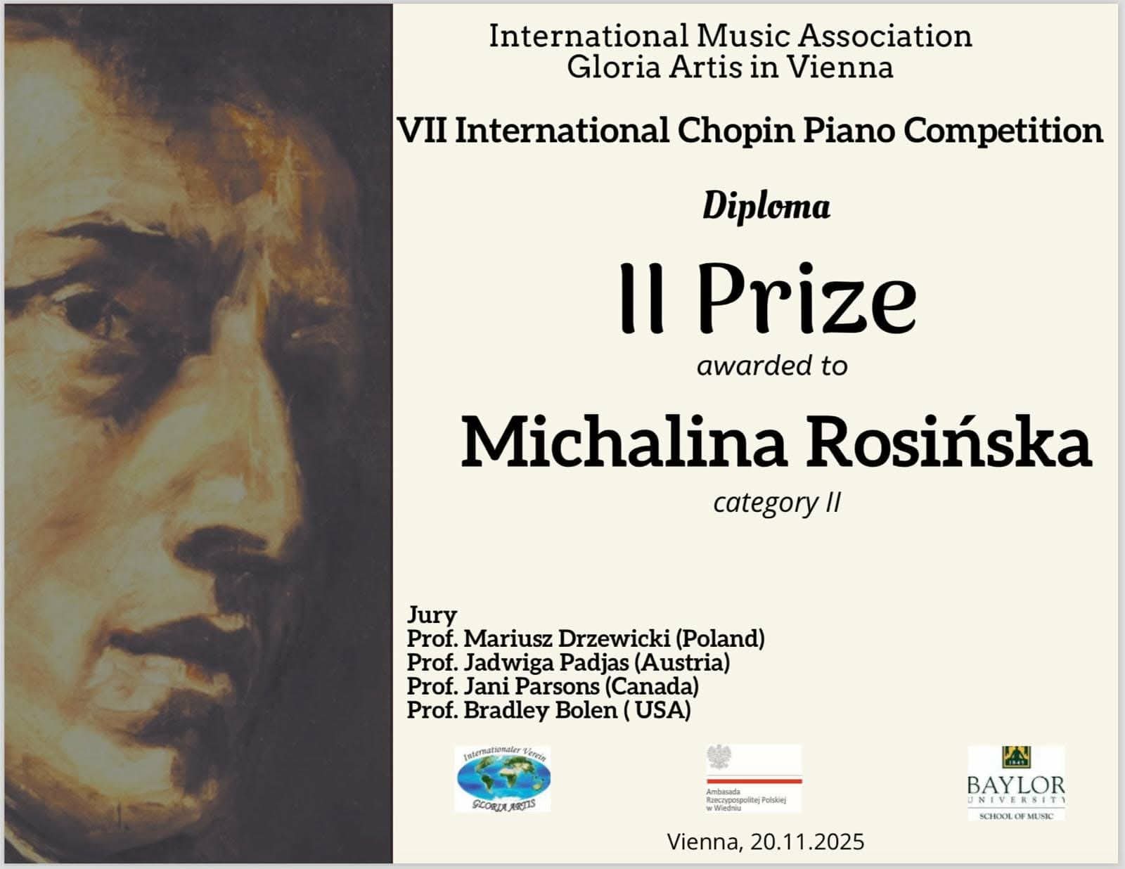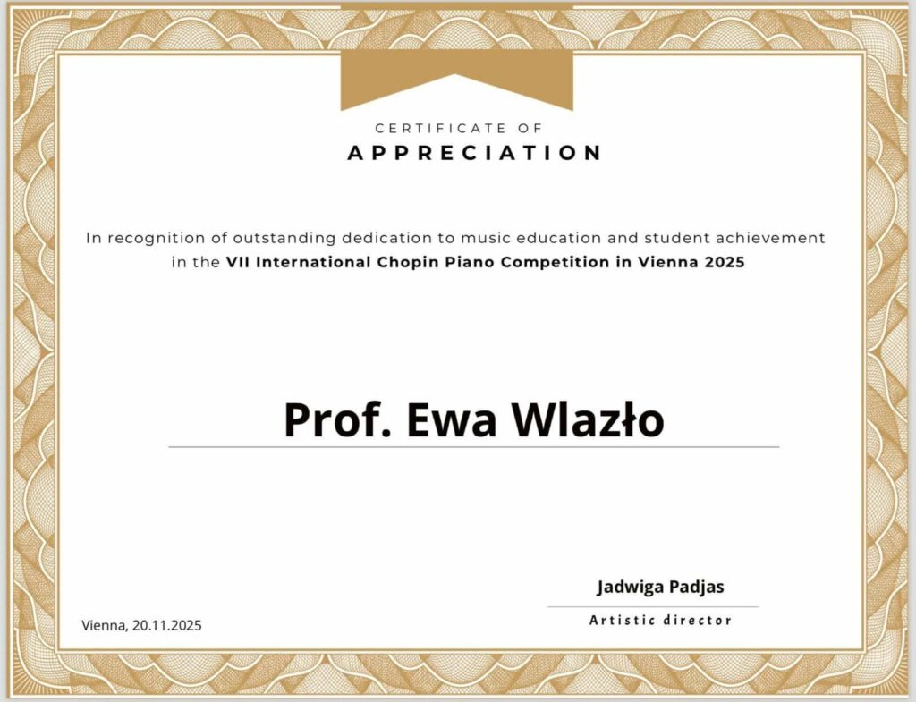 Lubimy takie wiadomości. Uczennica Państwowej Szkoły Muzycznej I st. Michalina Rosińska z klasy V c6 fortepianu p.Ewy Wlazło w dniu 20 listopada, br. zajęła II miejsce w VII Międzynarodowym Konkursie Pianistycznym im. Fryderyka Chopina w Wiedniu (VII INTERNATIONAL CHOPIN PIANO COMPETITION IN VIENNA 2025) edycja online. Konkurs posiada wyjątkowy prestiż muzyczny, zorganizowany został przez Międzynarodowe Stowarzyszenie Muzyczne “Gloria Artis”.