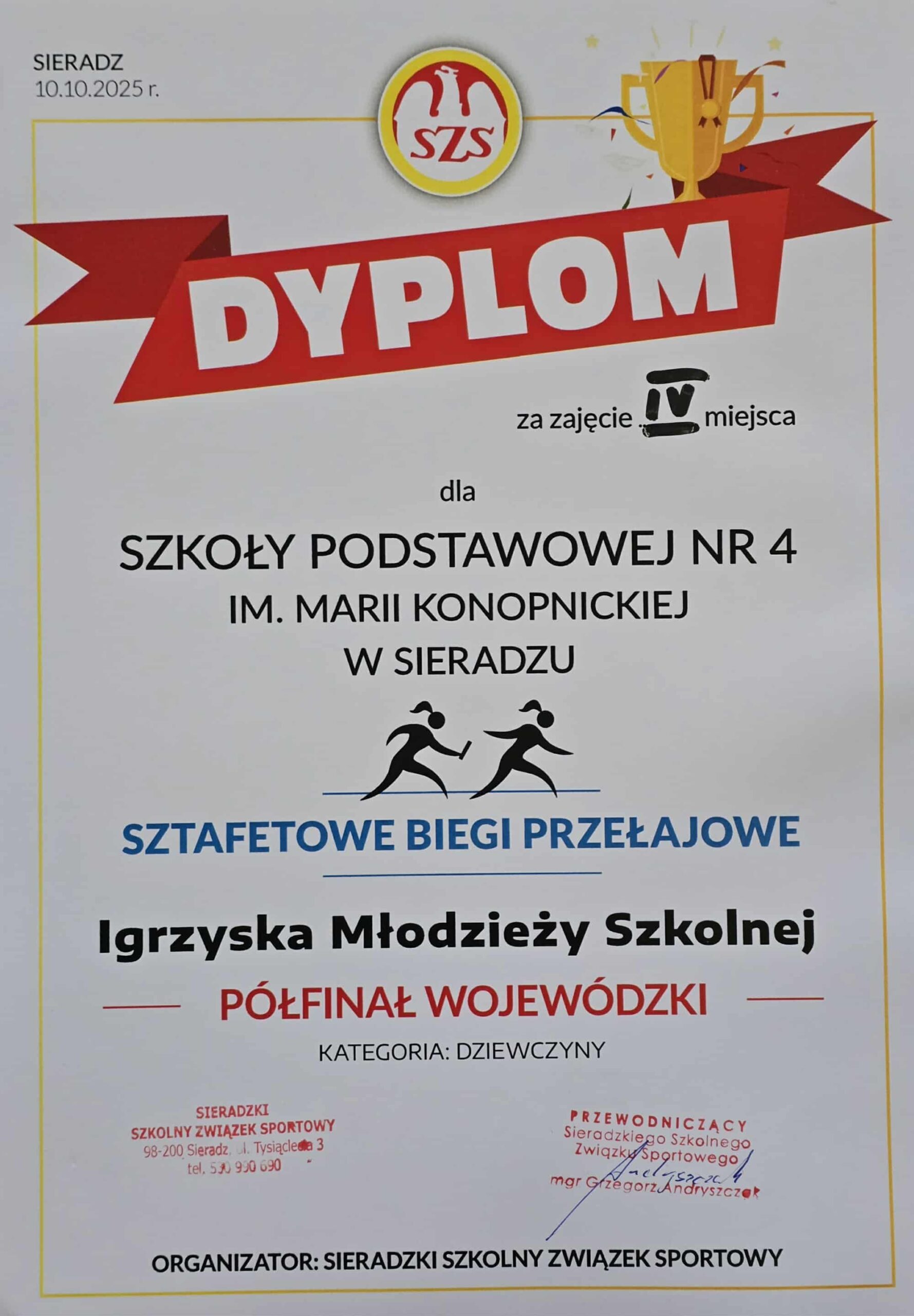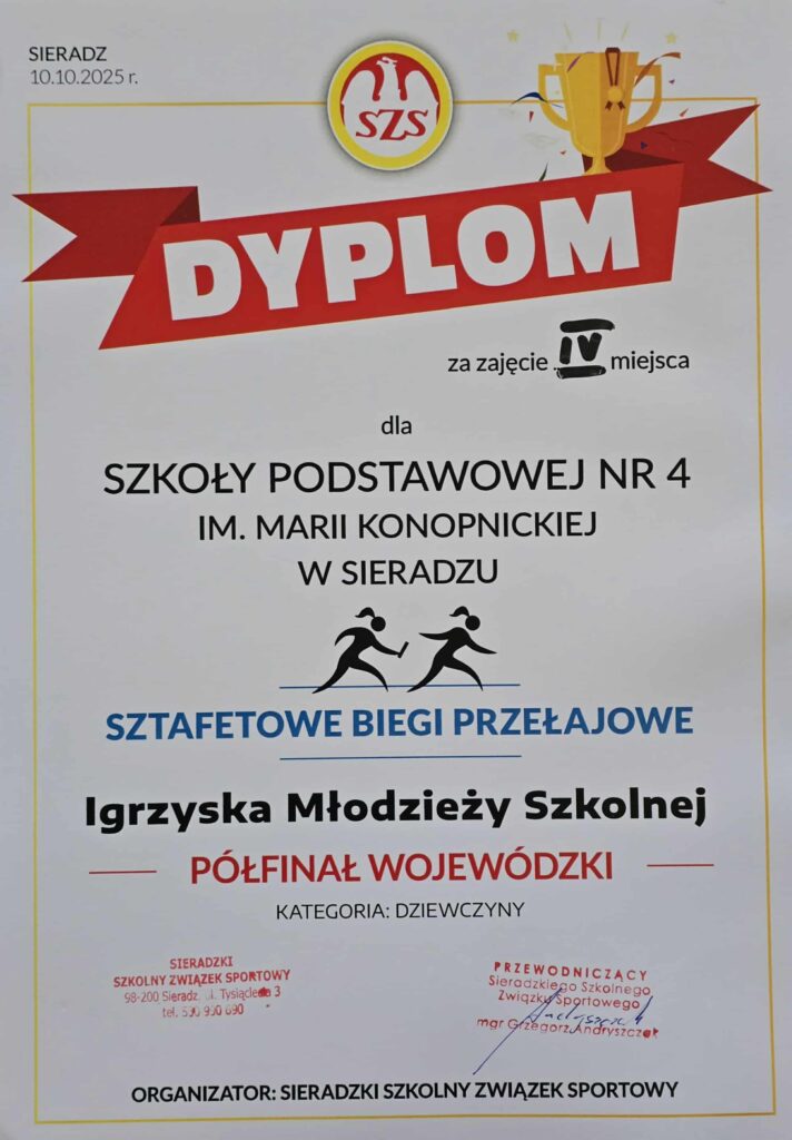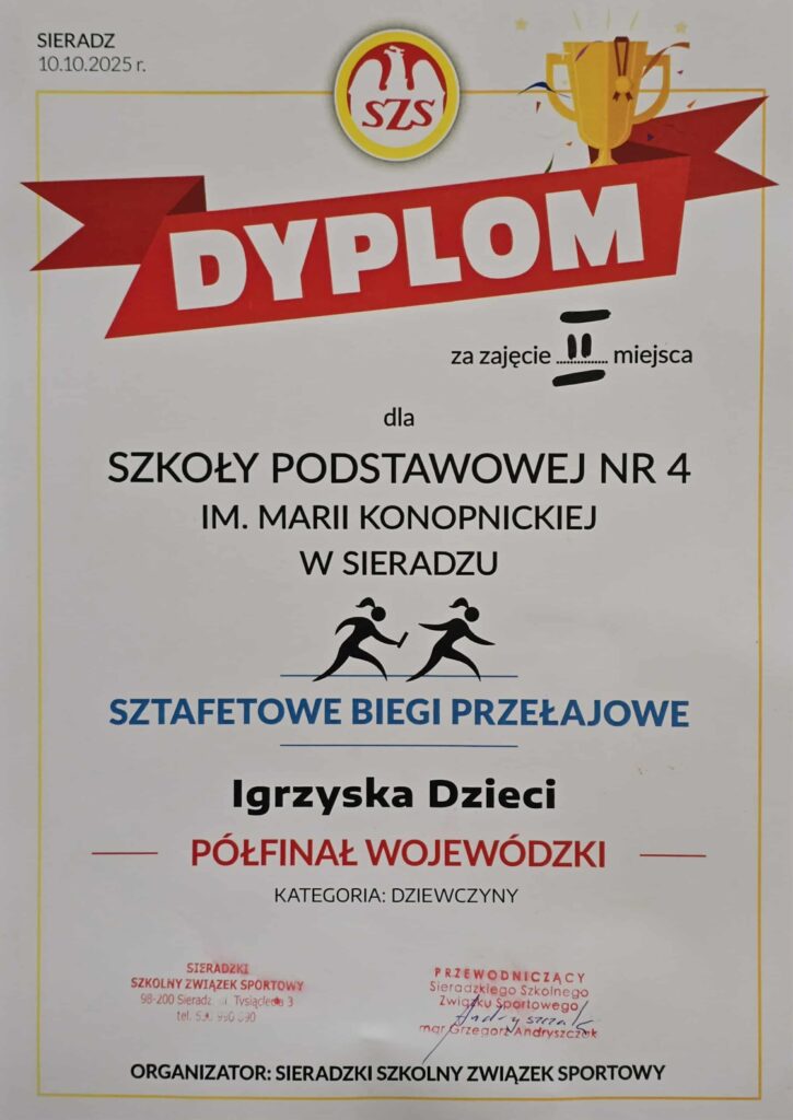 W dniu 10.10.2025r. w parku im. A. Mickiewicza w Sieradzu odbył się Półfinał Wojewódzki w sztafetowych biegach przełajowych. Reprezentacja młodsza (Igrzyska Dzieci) po bardzo ciężkim biegu w deszczu, błocie i przy silnym wietrze wywalczyła miejsce II. Jednocześnie zapewniła sobie awans do Finału Wojewódzkiego! Dziewczęta starsze (Igrzyska Młodzieży Szkolnej) w równie niesprzyjających warunkach pogodowych zajęła miejsce IV.