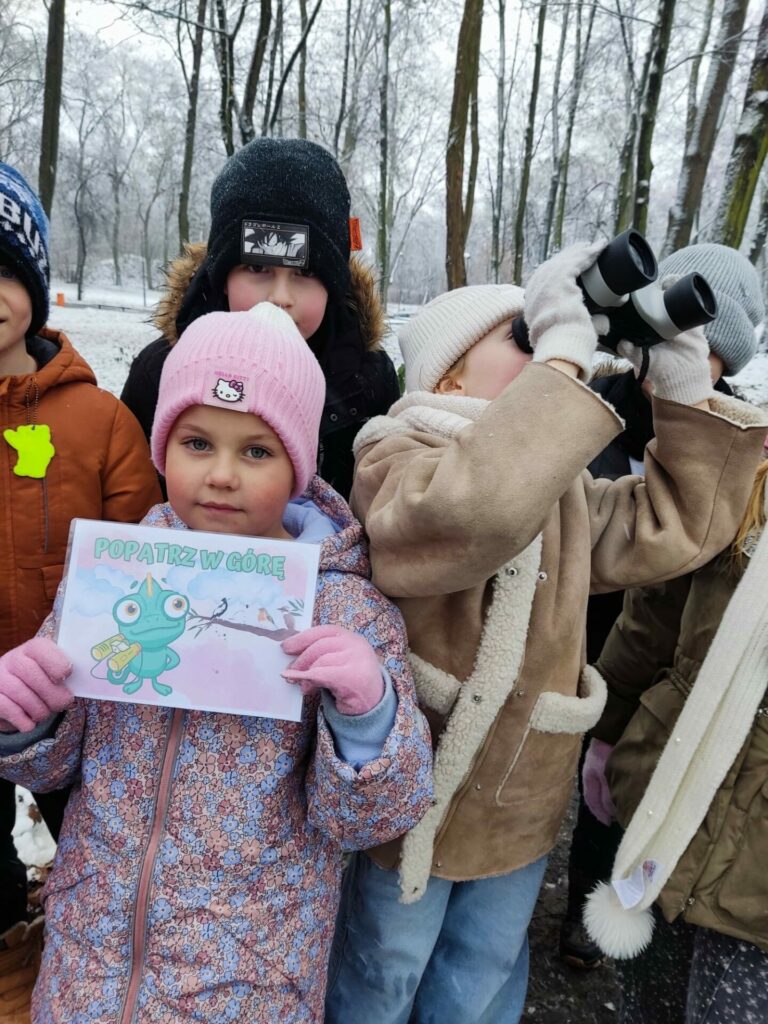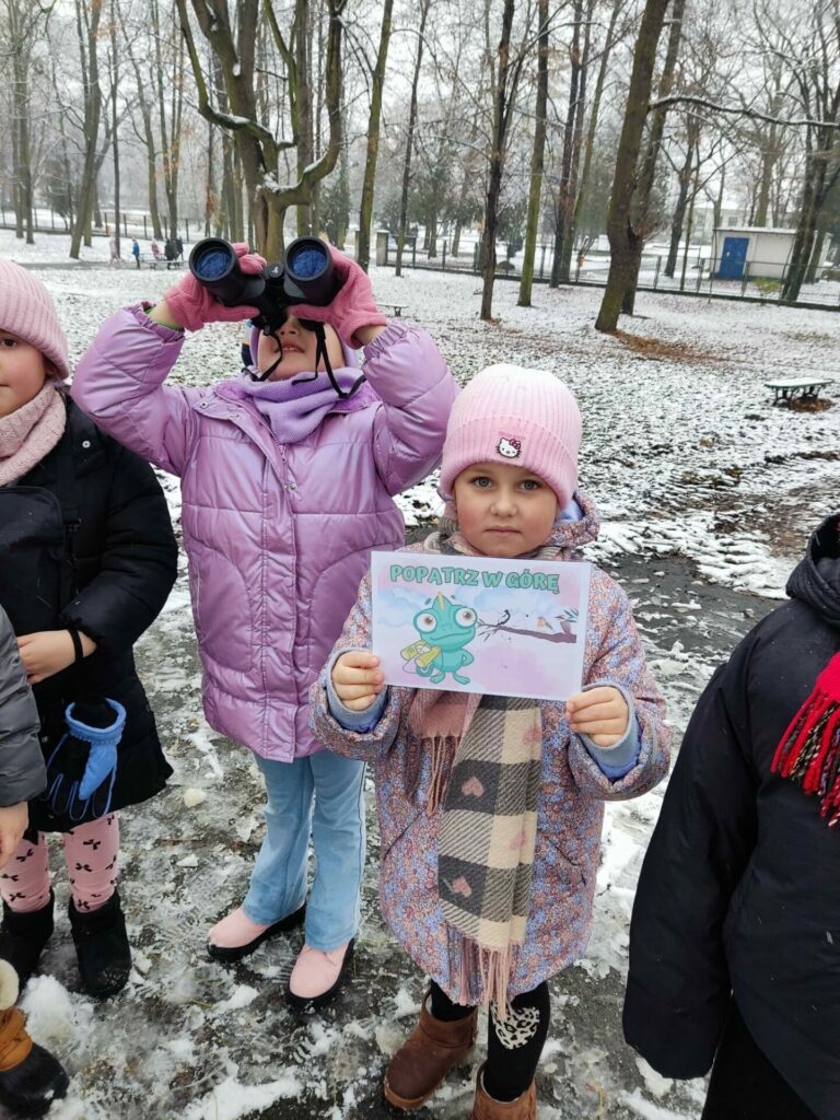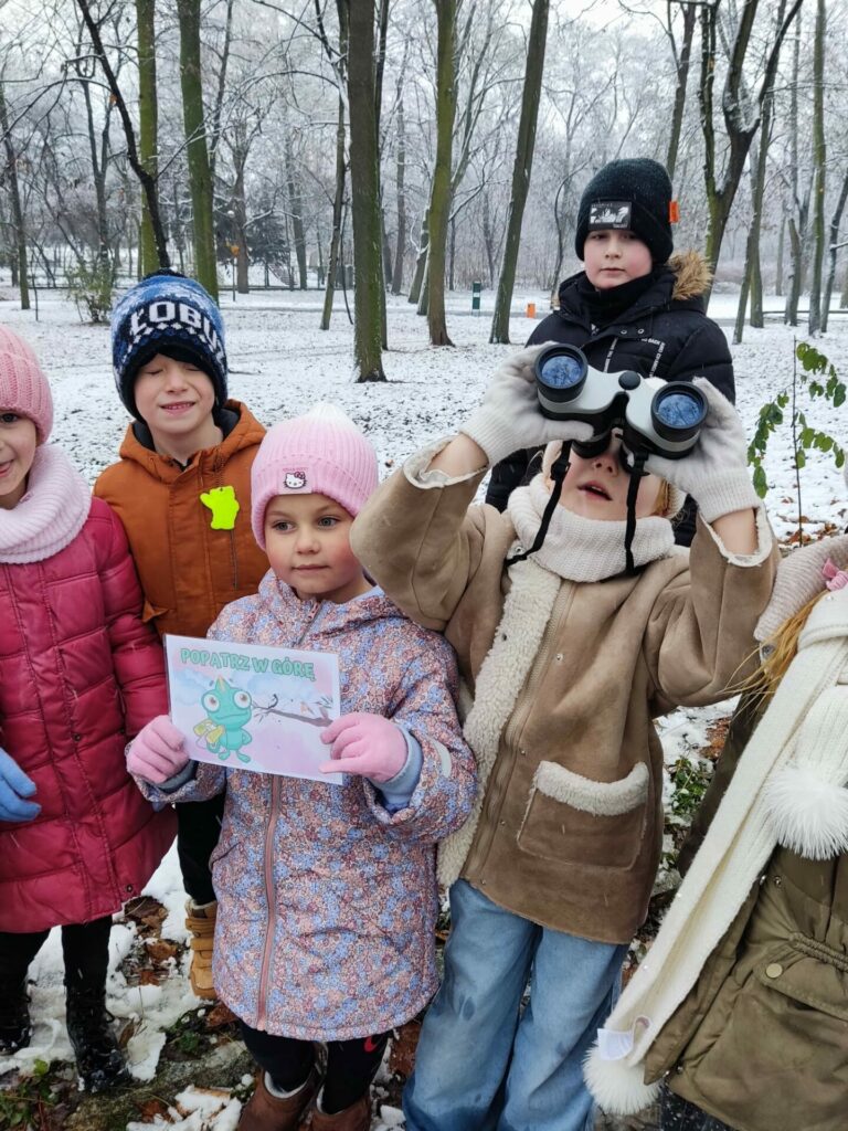 Klasa 1b w dniu dzisiejszym zrealizowała pierwsze zadanie z projektu Kameleon – „Popatrz w górę”. Podczas wyjścia do parku miejskiego uczniowie korzystali z lornetek, dzięki czemu mogli podziwiać świat przyrody z zupełnie nowej perspektywy – obserwowali korony drzew, ptaki oraz zmieniające się jesienne barwy.