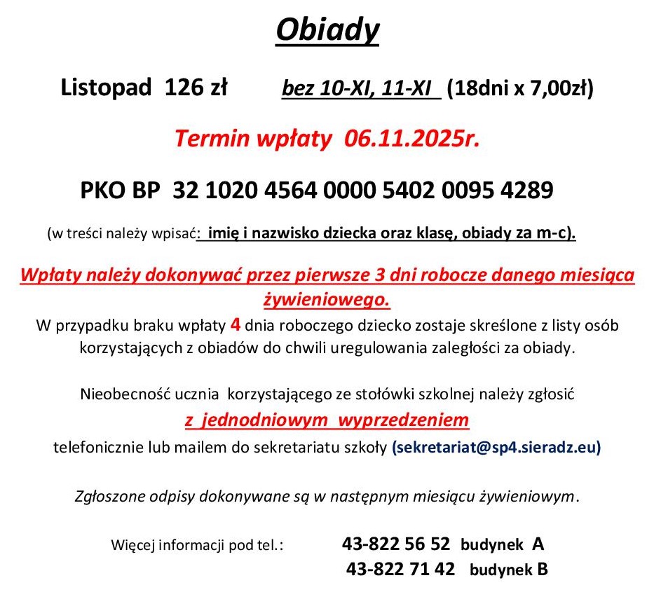 Strona główna Szkoła O nas Więcej o naszej szkole. Nauczyciele Nauczyciele uczący w SP4. Dokumenty INFO Wszystkie przydatne dokumenty. Pedagog i psycholog Godziny dyżurów Ceremoniał Certyfikaty INFO Świetlica Aktualności 16 listopada, 2025 Uroczystości upamiętniające tragiczne wydarzenie z 1939r. 16 listopada, 2025 Lekcja historii w Oświęcimiu i Brzezince 16 listopada, 2025 Narodowe Święto Niepodległości - uroczysty apel dla klas V-VIII Przeczytaj wszystkie INFOJak wygląda życie Twojego dziecka w SP4? Przeczytaj aktualności z życia szkoły! Uczniowie Plan lekcji Samorząd uczniowski Zajęcia pozalekcyjne Dzwonki Szkolne koło CARITAS Kodeks ucznia Rodzice Rekrutacja Wyprawka do klasy 1. Rada rodziców Dokumenty do pobrania Stołówka Oferta zajęć pozalekcyjnych Pomoc psychologiczno – pedagogiczna Dziennik Kontakt Dyżury dyrektora szkoły R. Pawlikowska: bud. A - wt. 13.30-14.30, bud. B - śr. 15.00-16.00 I. Jankowska: bud. B - pn. 8.30-9.30, wt. 15.30-16.30 J. Żuber : bud. A - pn. 7.45-8.45, czw. 15.30-16.30 Odkryj zalety SP4 Masz pytania? Skontaktuj się z nami! KONTAKT