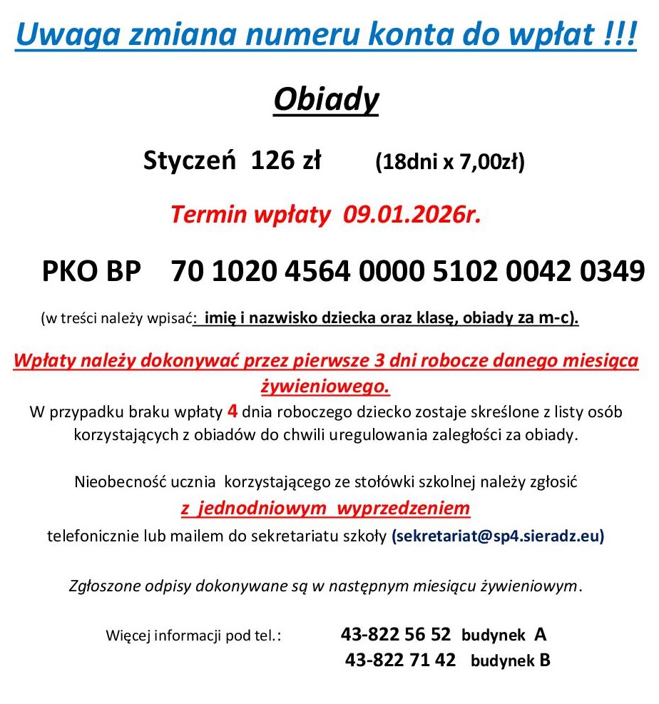 Strona główna Szkoła O nas Więcej o naszej szkole. Nauczyciele Nauczyciele uczący w SP4. Dokumenty INFO Wszystkie przydatne dokumenty. Pedagog i psycholog Godziny dyżurów Ceremoniał Certyfikaty INFO Świetlica Aktualności 14 stycznia, 2026 II miejsce koszykarzy i awans do Półfinału Wojewódzkiego 13 stycznia, 2026 Zwycięstwo naszych koszykarek w Powiatowych Igrzyskach Dzieci 11 stycznia, 2026 Edukacyjna podróż do świata nauki - wycieczka klas 6b i 6d do Chorzowa Przeczytaj wszystkie INFOJak wygląda życie Twojego dziecka w SP4? Przeczytaj aktualności z życia szkoły! Uczniowie Plan lekcji Samorząd uczniowski Zajęcia pozalekcyjne Dzwonki Szkolne koło CARITAS Kodeks ucznia Rodzice Rekrutacja Wyprawka do klasy 1. Rada rodziców Dokumenty do pobrania Stołówka Oferta zajęć pozalekcyjnych Pomoc psychologiczno – pedagogiczna Dziennik Kontakt Dyżury dyrektora szkoły R. Pawlikowska: bud. A - wt. 13.30-14.30, bud. B - śr. 15.00-16.00 I. Jankowska: bud. B - pn. 8.30-9.30, wt. 15.30-16.30 J. Żuber : bud. A - pn. 7.45-8.45, czw. 15.30-16.30 Odkryj zalety SP4 Masz pytania? Skontaktuj się z nami! KONTAKT