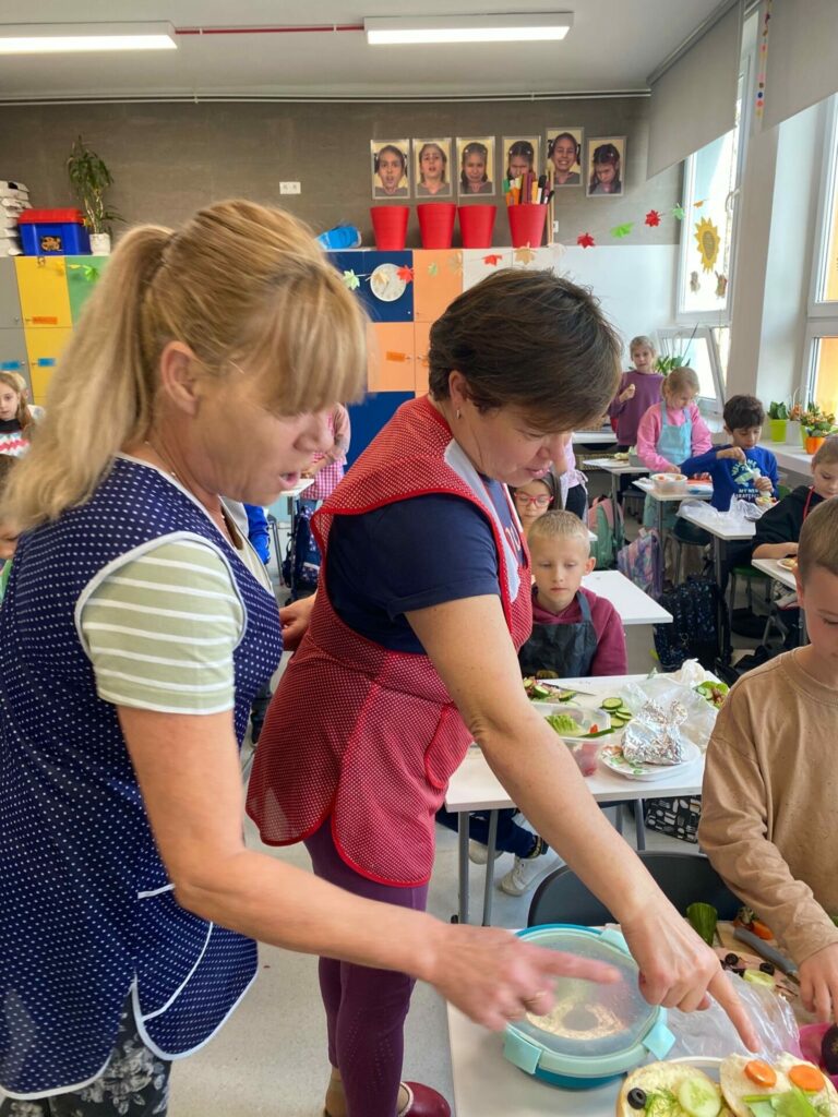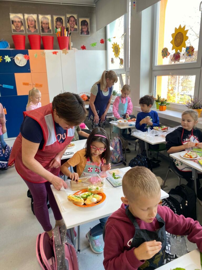W klasie 1a odbyły się warsztaty kulinarne, które poprowadziła wychowawczyni pani J. Trojszczak. Uczniowie rozpoczęli zajęcia od rozmowy o piramidzie zdrowia oraz o roli warzyw i owoców w codziennej diecie. Następnie przystąpili do pracy – przygotowywali kolorowe i wesołe kanapeczki, które wyglądały i smakowały wyśmienicie! Efekty kulinarnych zmagań oceniły szkolne kucharki – pani Agnieszka i pani Beatka, które nie szczędziły pochwał młodym kucharzom. To była nie tylko smaczna, ale też bardzo pouczająca lekcja o tym, jak dbać o zdrowie poprzez właściwe odżywianie.
