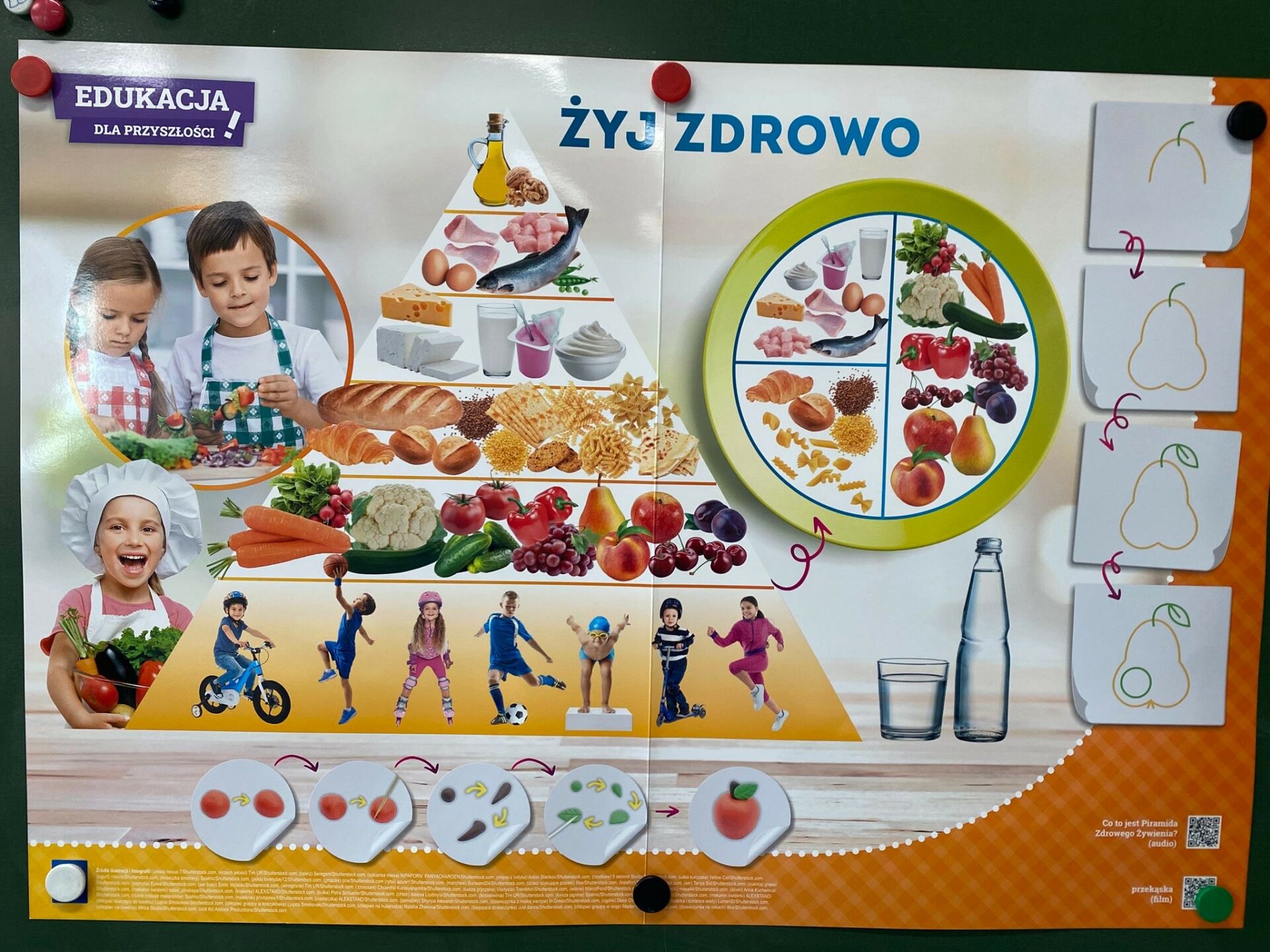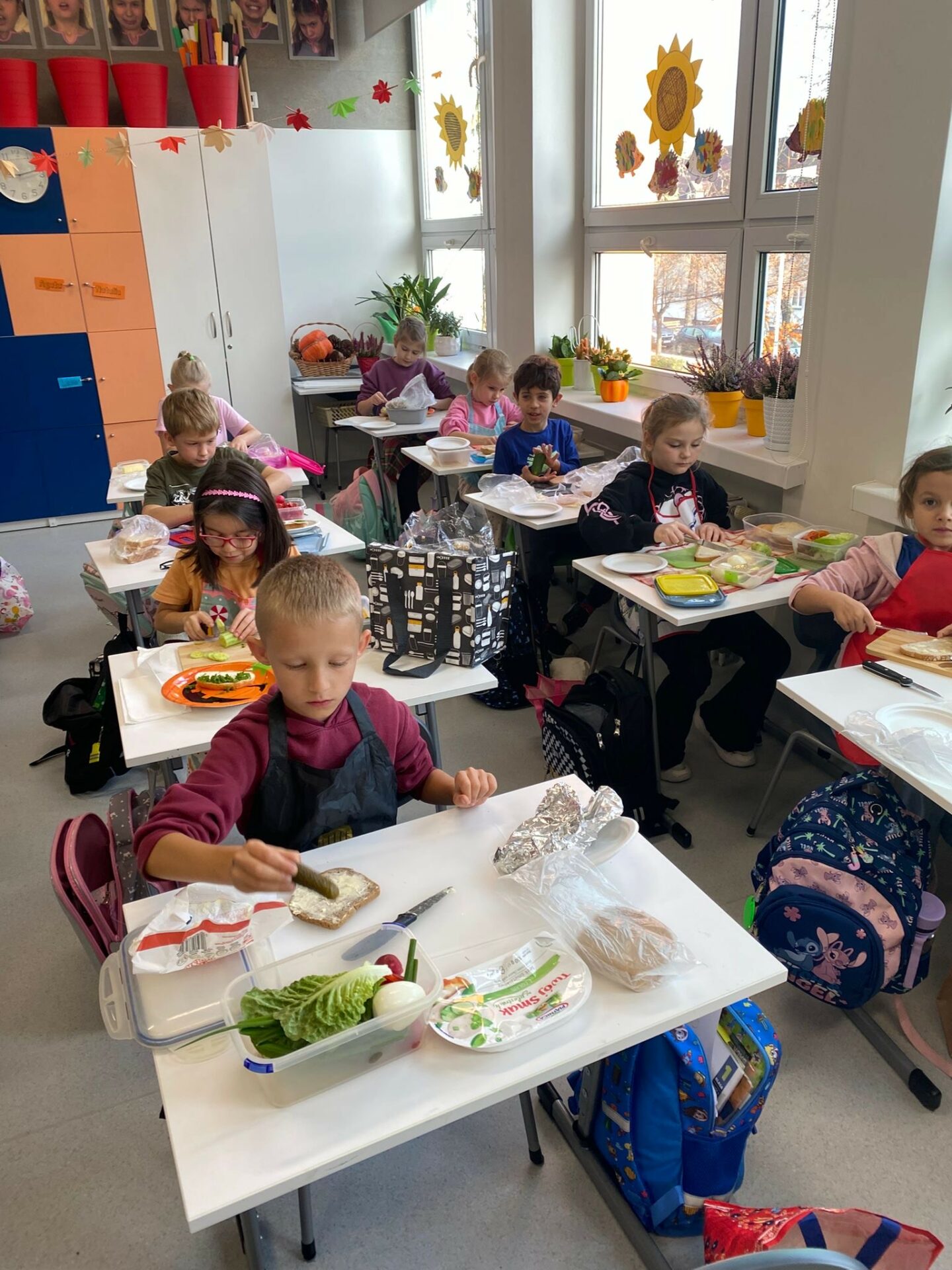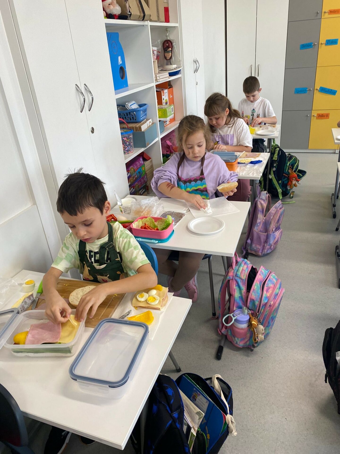 W klasie 1a odbyły się warsztaty kulinarne, które poprowadziła wychowawczyni pani J. Trojszczak. Uczniowie rozpoczęli zajęcia od rozmowy o piramidzie zdrowia oraz o roli warzyw i owoców w codziennej diecie. Następnie przystąpili do pracy – przygotowywali kolorowe i wesołe kanapeczki, które wyglądały i smakowały wyśmienicie! Efekty kulinarnych zmagań oceniły szkolne kucharki – pani Agnieszka i pani Beatka, które nie szczędziły pochwał młodym kucharzom. To była nie tylko smaczna, ale też bardzo pouczająca lekcja o tym, jak dbać o zdrowie poprzez właściwe odżywianie.