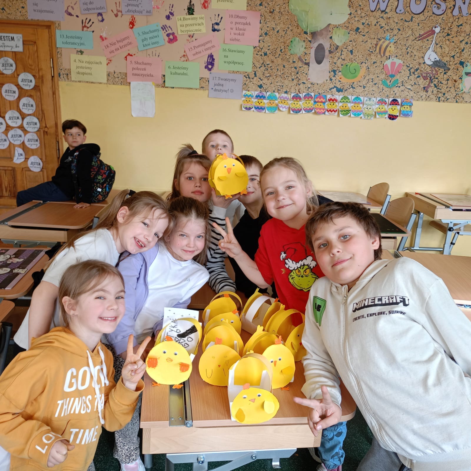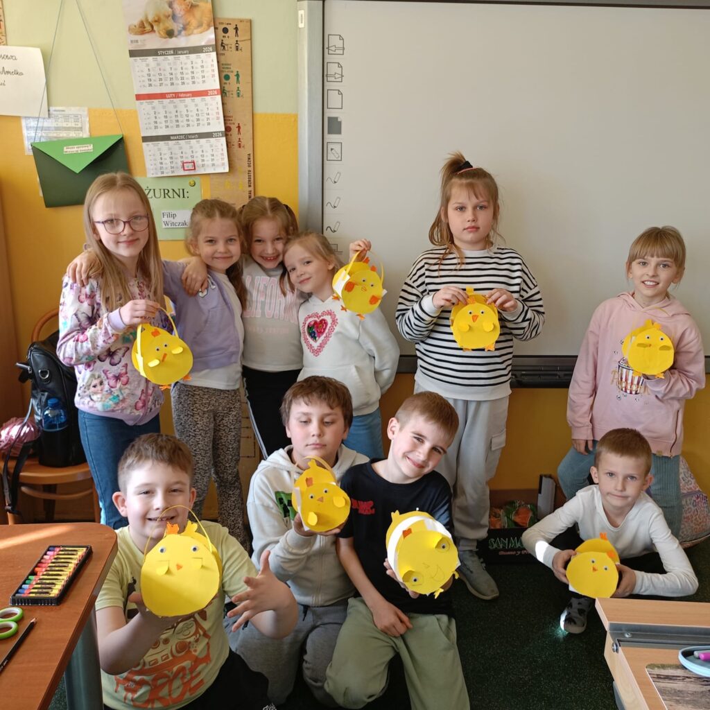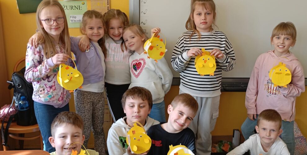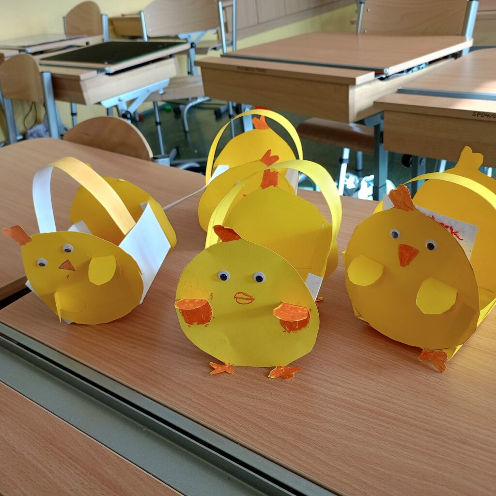 Dzisiaj dzieci w świetlicy szkolnej z dużym zaangażowaniem przygotowywały wielkanocne koszyczki w kształcie uroczych kurczaczków.
