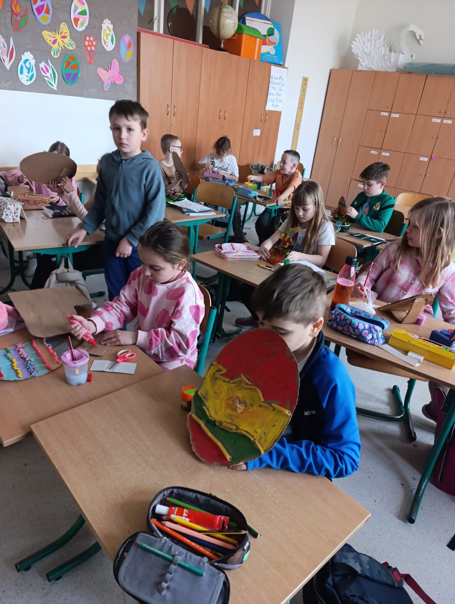 W klasie 2d wprowadzamy wiosenno-świąteczny klimat. Podczas zajęć plastyczno-technicznych uczniowie z zapałem zabrali się do pracy i wykonali piękne kolorowe jajka, które zdobią naszą salę. Proces twórczy odbywał się przy anglojęzycznych piosenkach o wiośnie, dzięki czemu dzieci szlifują swoje umiejętności językowe i przyswajają nowe słówka, łączymy przyjemne z pożytecznym, zobaczcie sami.